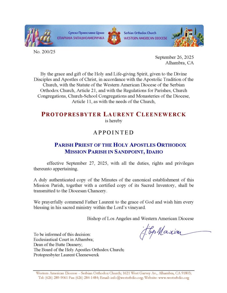 Below, document establishing the parish in Sandpoint as Holy Apostles and assigning Fr Laurent Cleenewerck as rector / assigned priest.